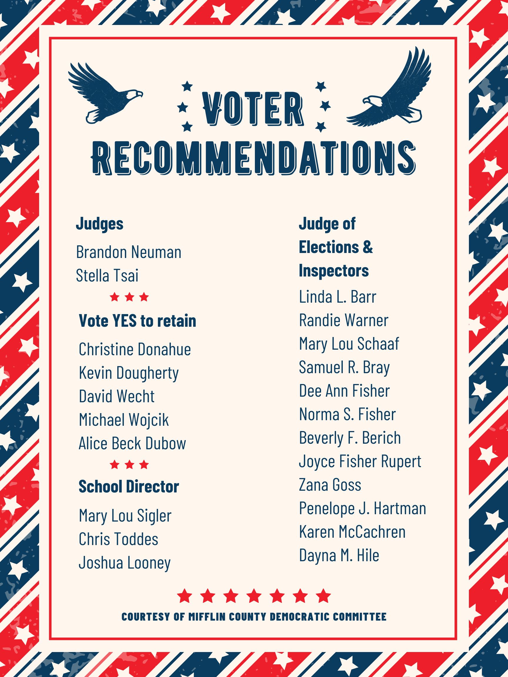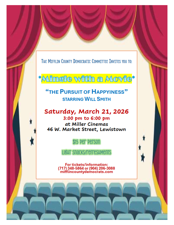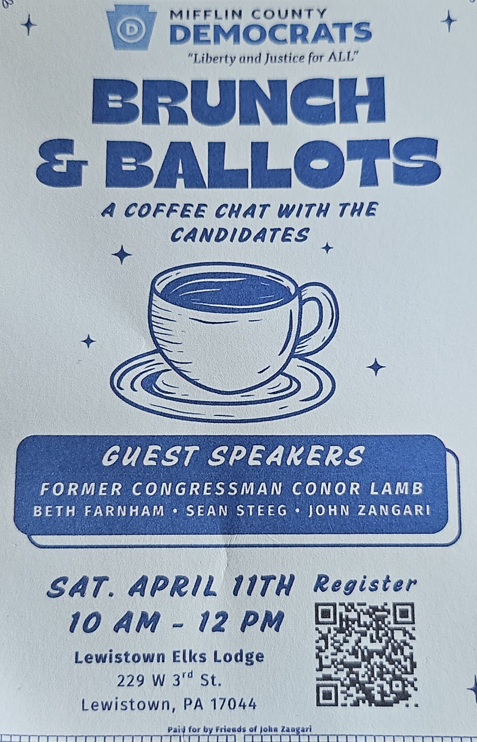 Every third Wednesday of the month at 6:30pm at the United Steel Workers Union Hall, 519 Electric Avenue, Lewistown. Meeting announcements also posted in The Sentinel’s Calendar section 3 days prior to the meeting.